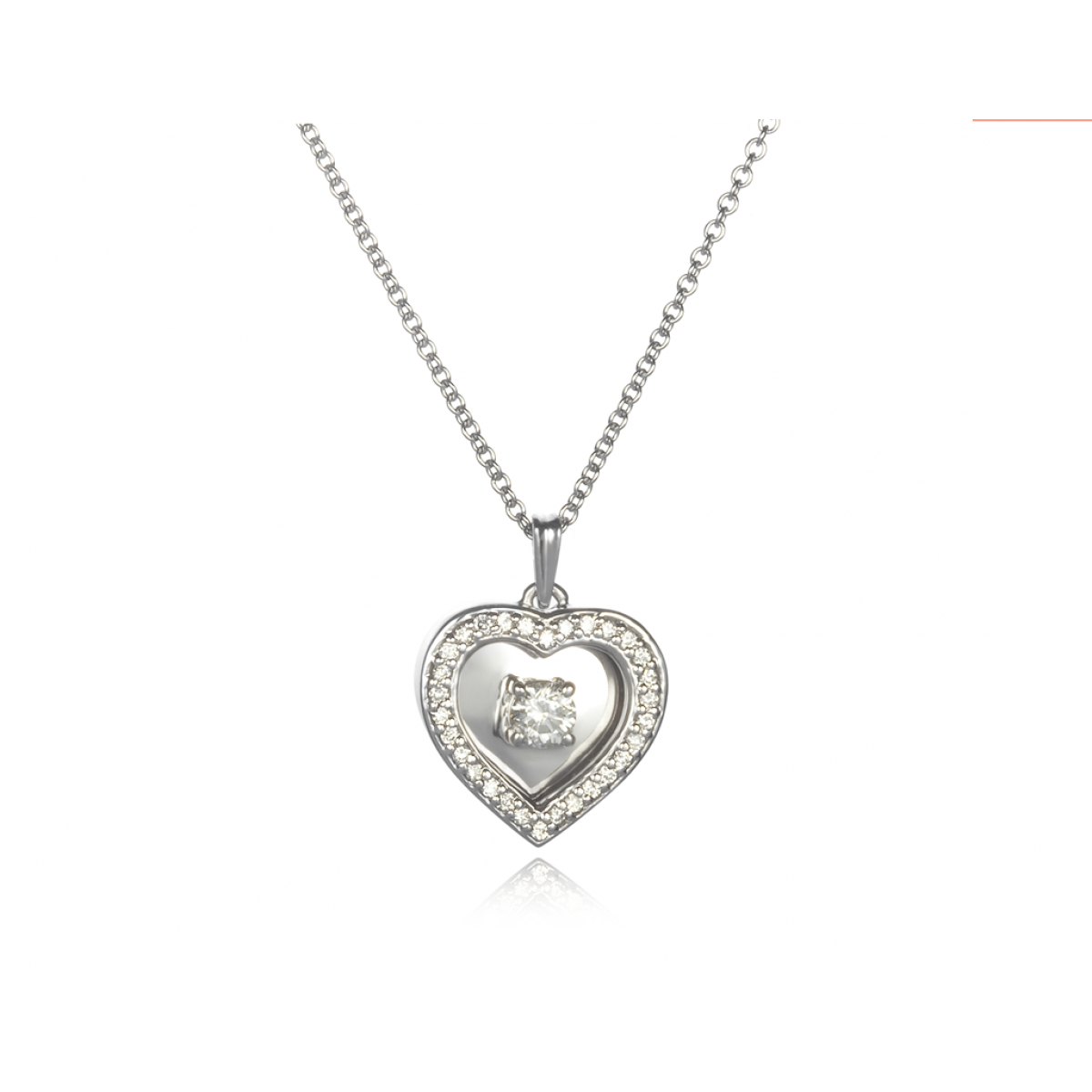 14kt. White Gold 1/3ctw Round Brilliant Cut diamond Solitaire center diamond edged frame Heart Pendant on a Cable Chain