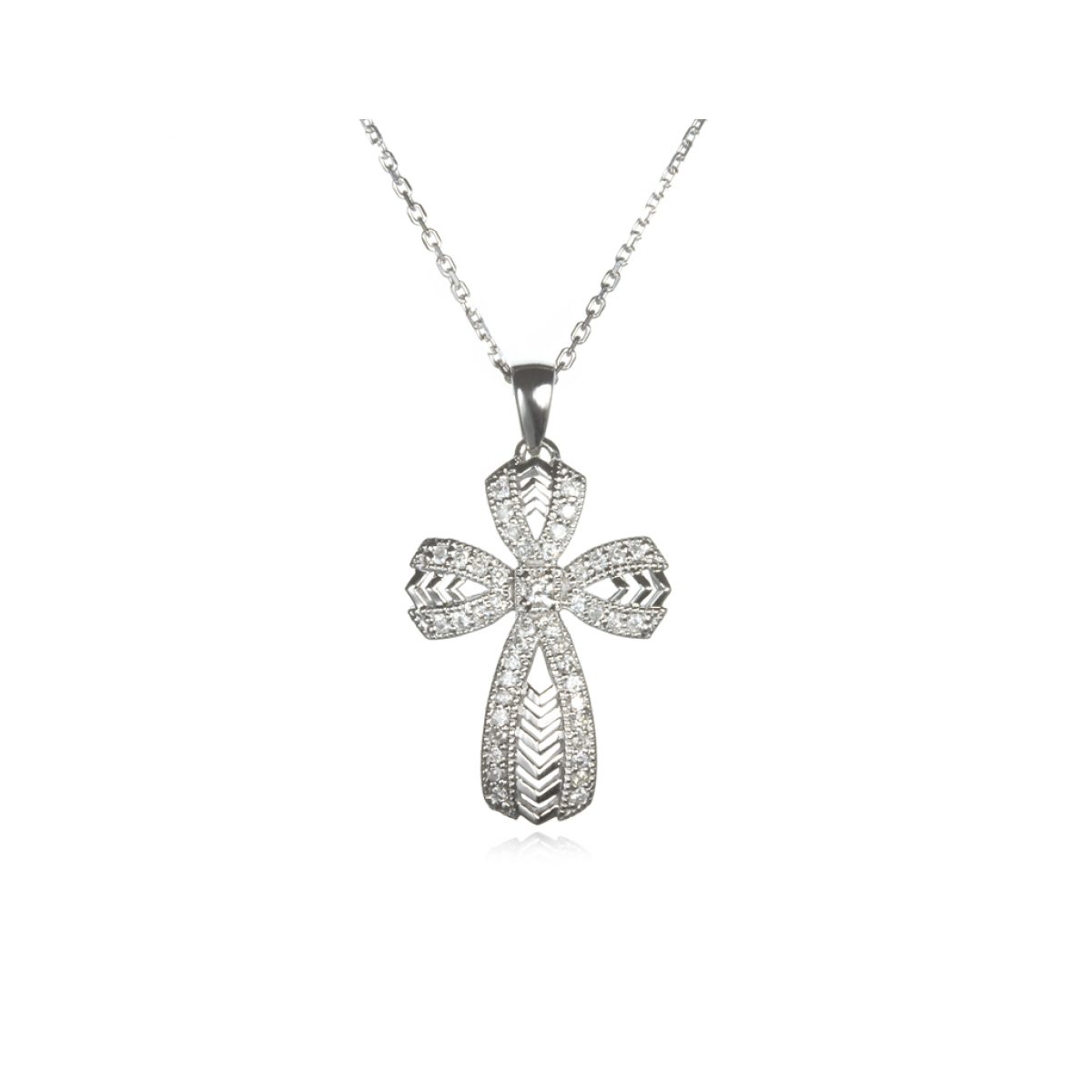 14kt. White Gold 1/3ctw Round Brilliant Cut diamond Vintage style Beaded Edges Cross Pendant on a Cable Chain