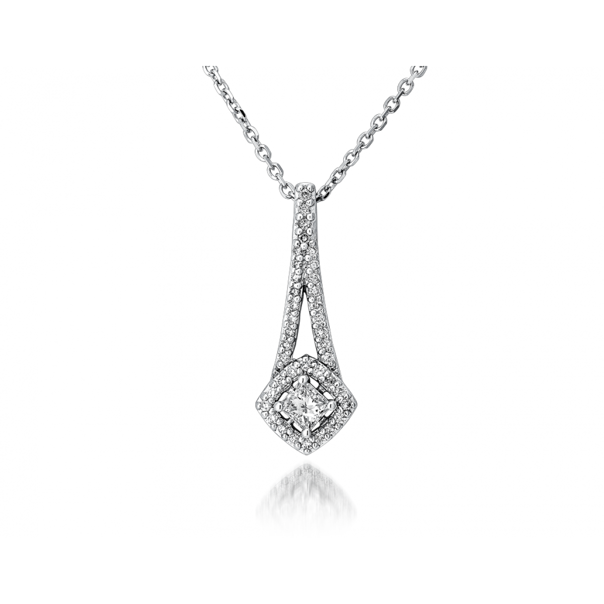 14kt. White Gold 3/4ctw Round Brilliant Cut and Princess Cut center diamond Prong Set Halo Drop Slide Pendant on a Cable Chain
