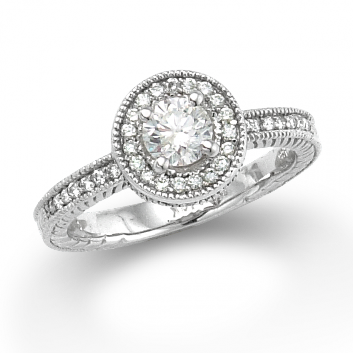 14kt. White Gold 7/8ctw RBC Diamond Mill Grain Edges Halo Engagement Ring