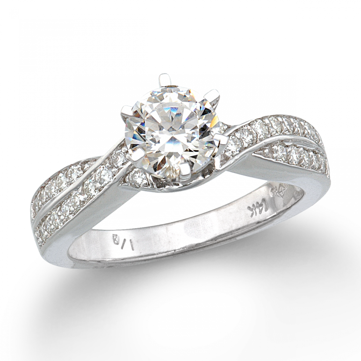 14kt. White Gold 3/4ctw RBC Diamond Six Prong Center Stone with Diamond Studded Twist Design Shank Engagement Ring