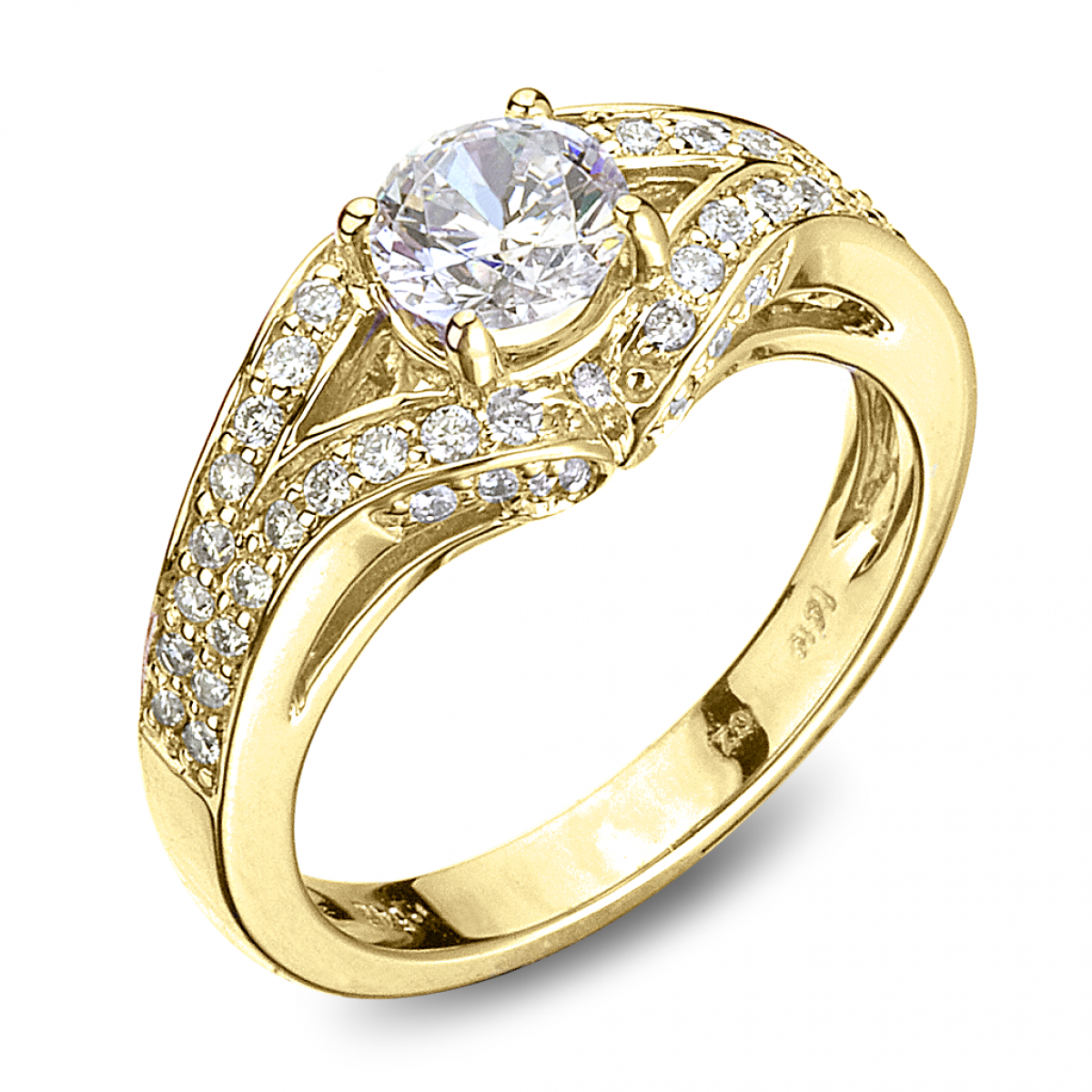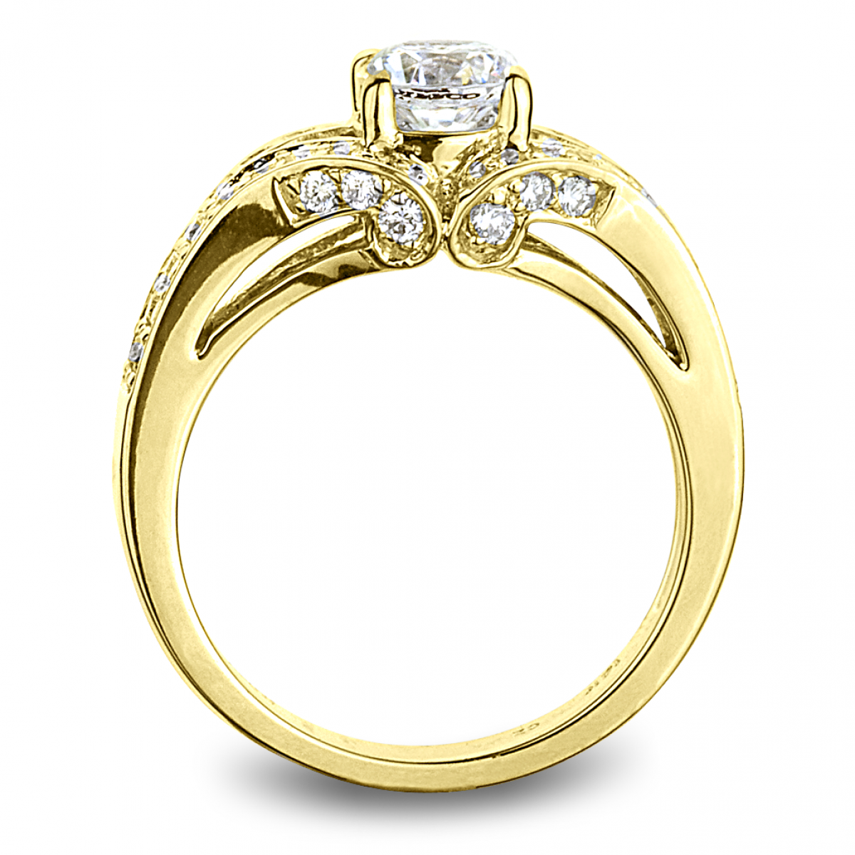 14kt. Yellow Gold 1.00ctw. RBC Diamond Engagement Ring With Two Rows Of RBC Diamonds On The Split Shank. Diamonds Accents the Side View with Four Prong Center Setting